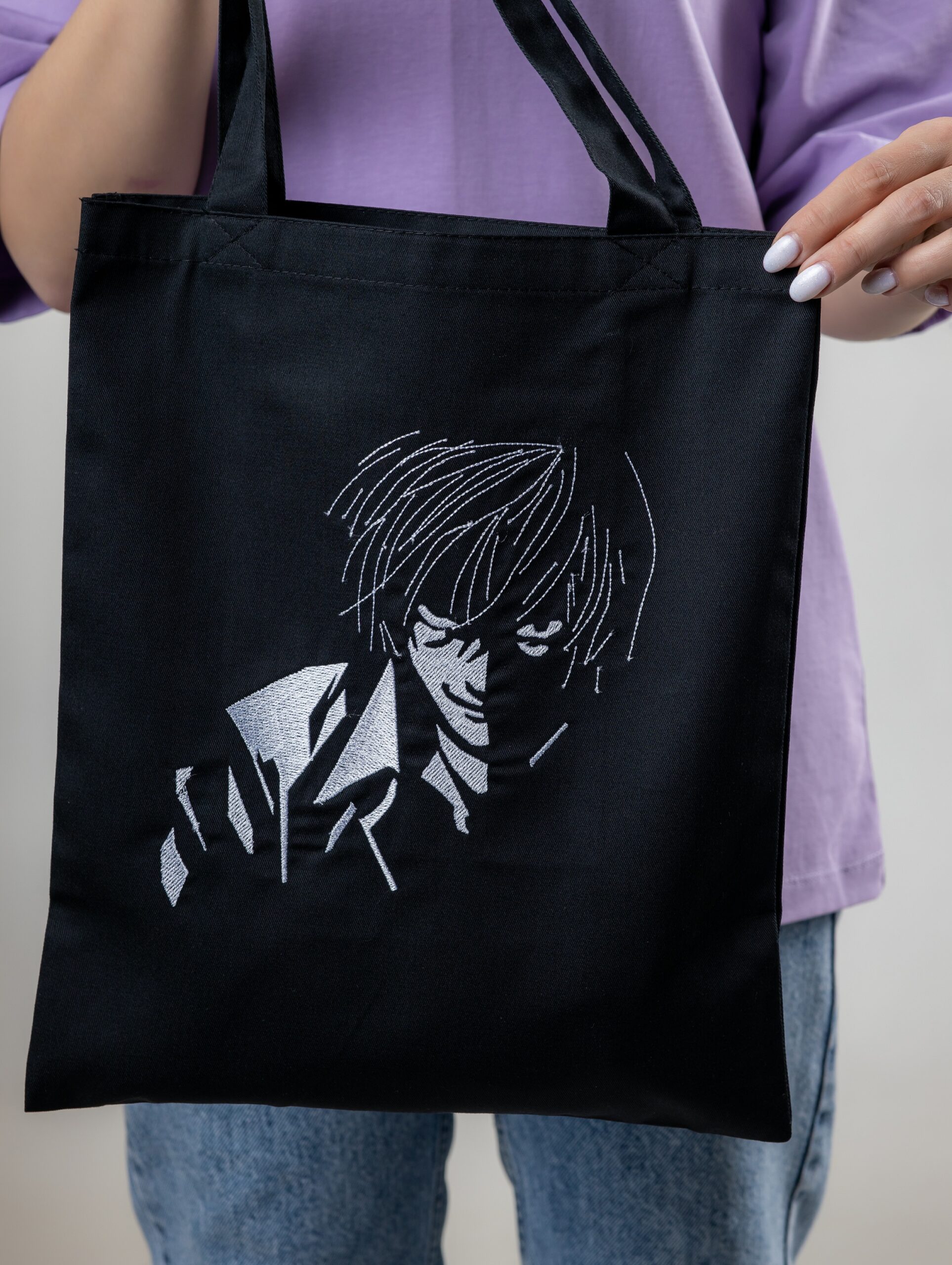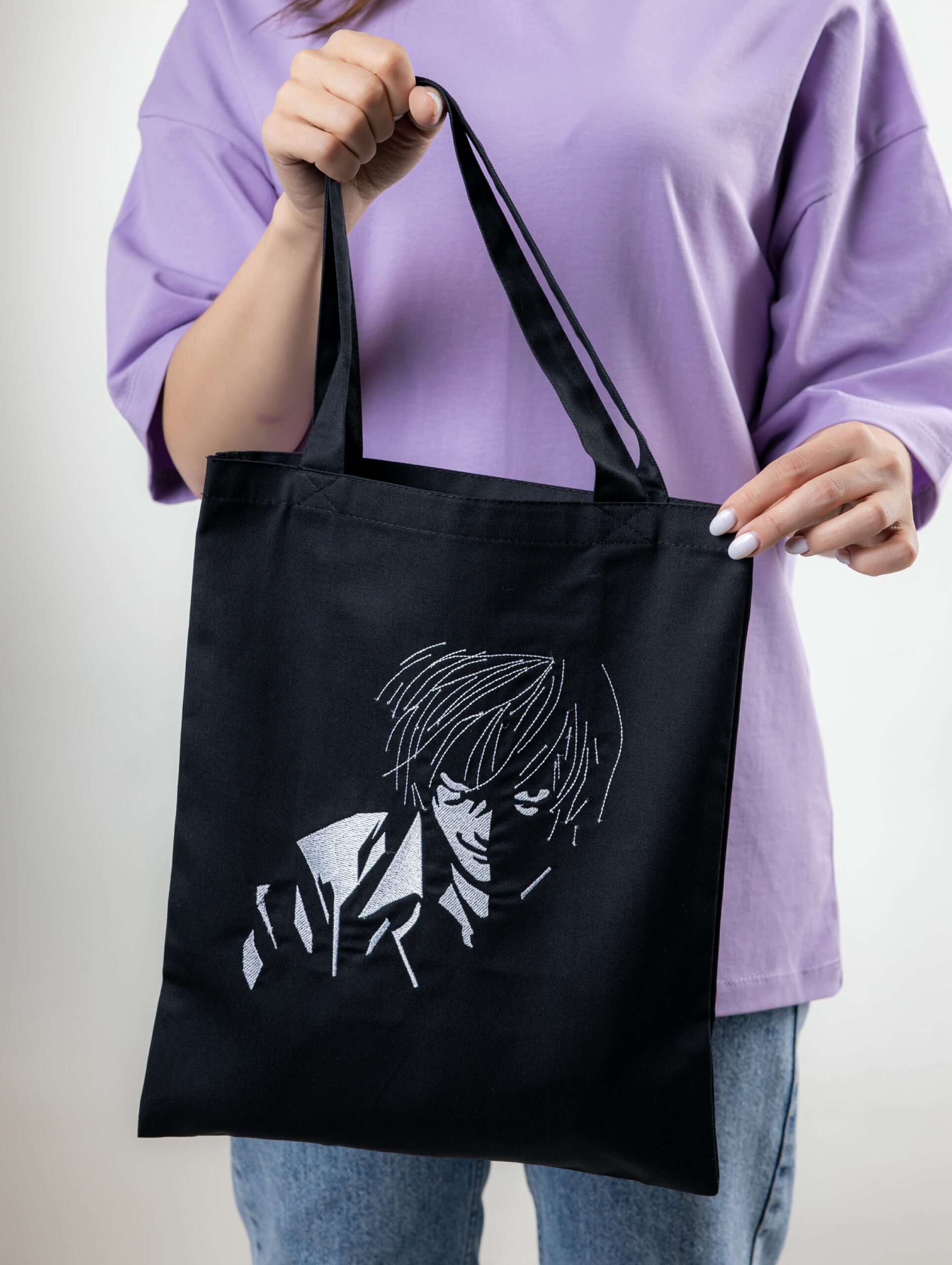Черный шоппер из плотной хлопковой ткани. Внутри имеется карман для телефона. Вышивка белыми нитками