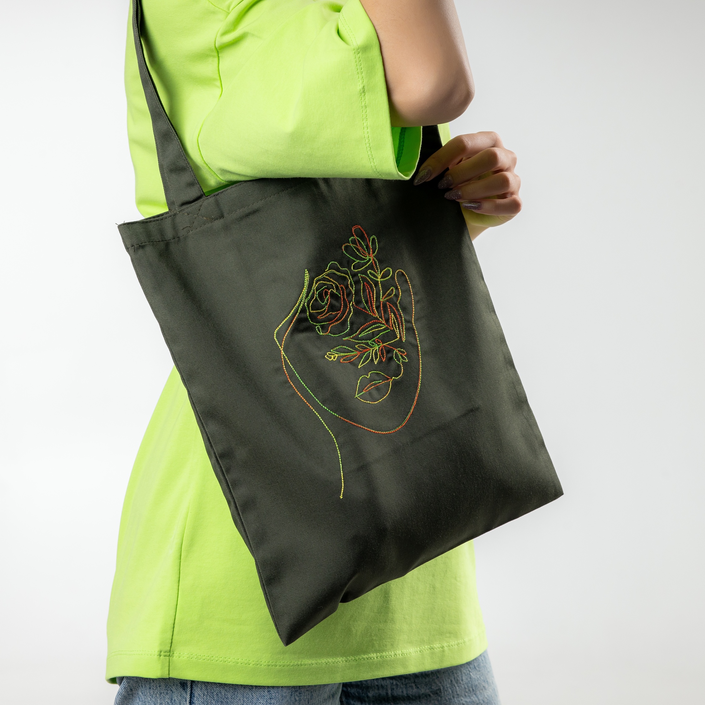 Зеленый шоппер из плотной хлопковой ткани. Внутри имеется карман для телефона. Вышивка.
